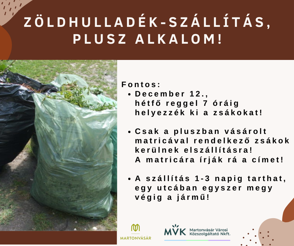 A VHG. Nkft. és az MVK Nkft. együttműködésének keretében, valamint Martonvásár Város Önkormányzatának többlet-finanszírozása mellett lehetőség van a zöldhulladék elszállíttatására.