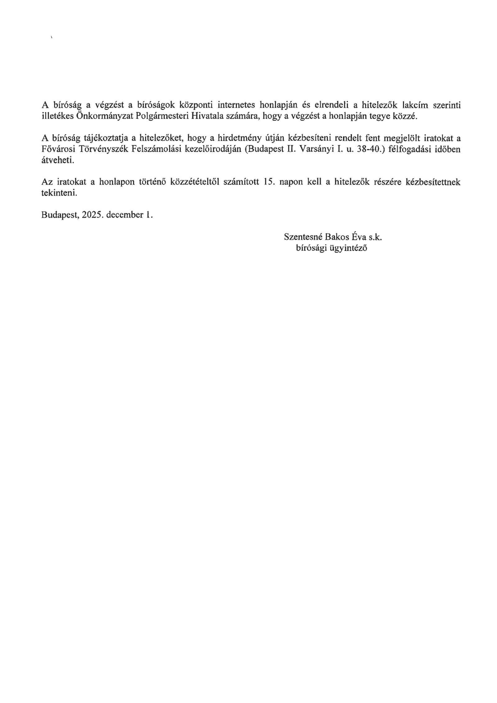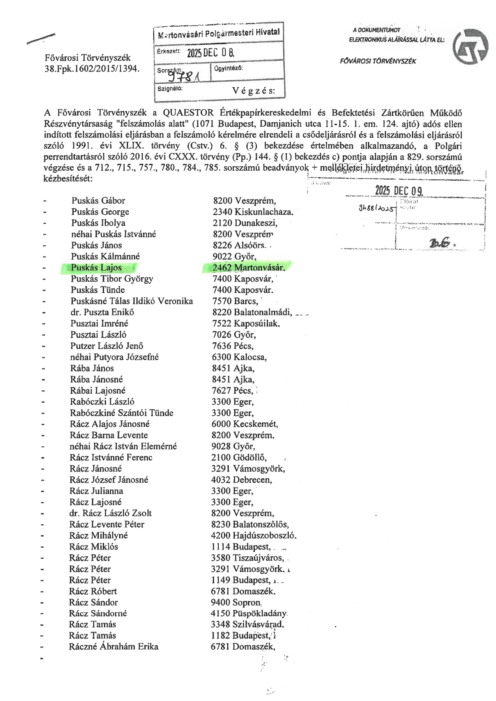 A Fővárosi Törvényszék hirdetménye a QUAESTOR ZRt felszámolási eljárása ügyében