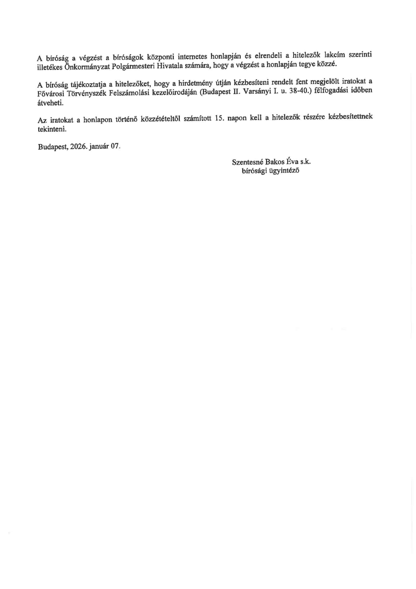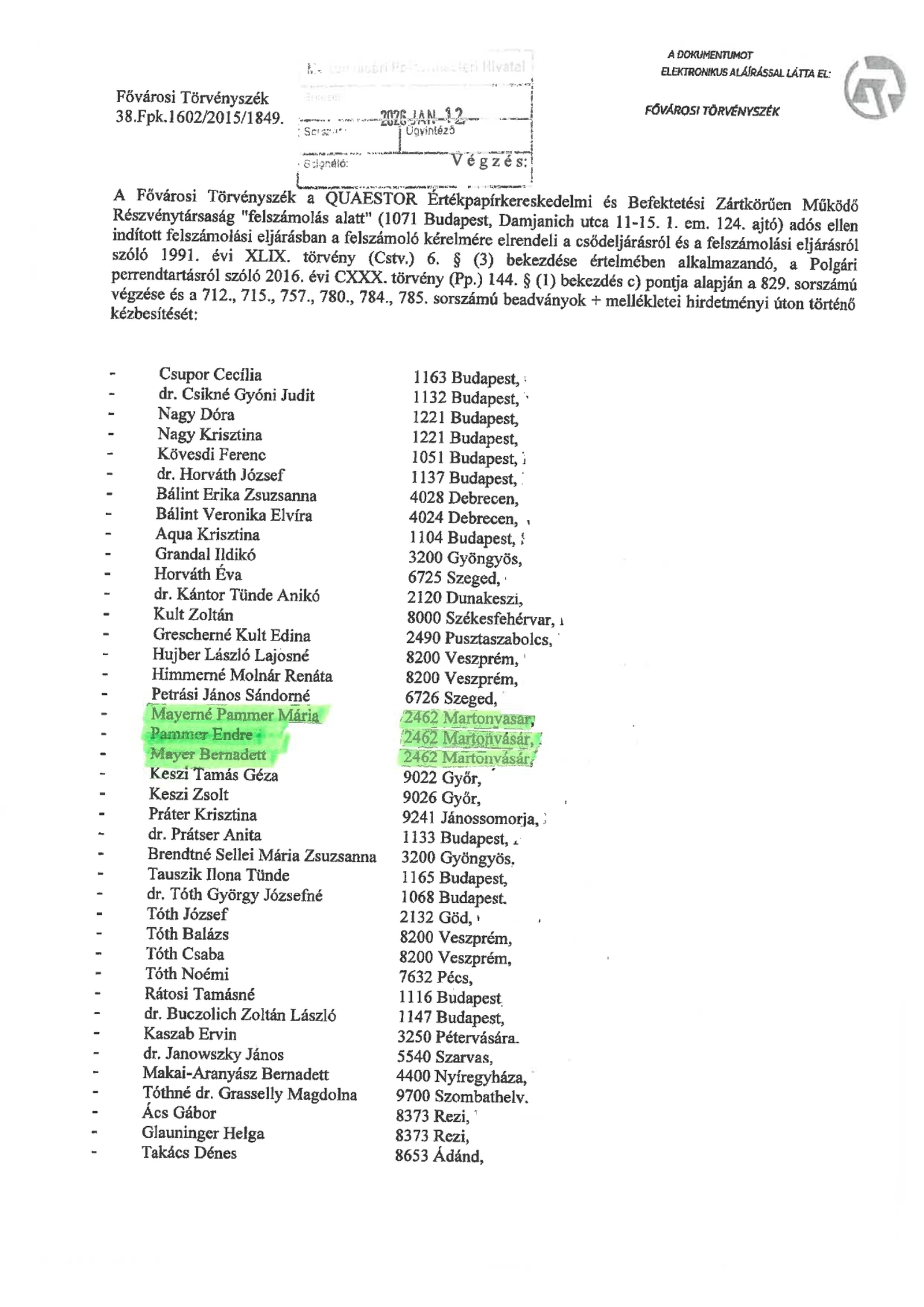 A Fővárosi Törvényszék hirdetménye a QUAESTOR ZRt felszámolási eljárása ügyében