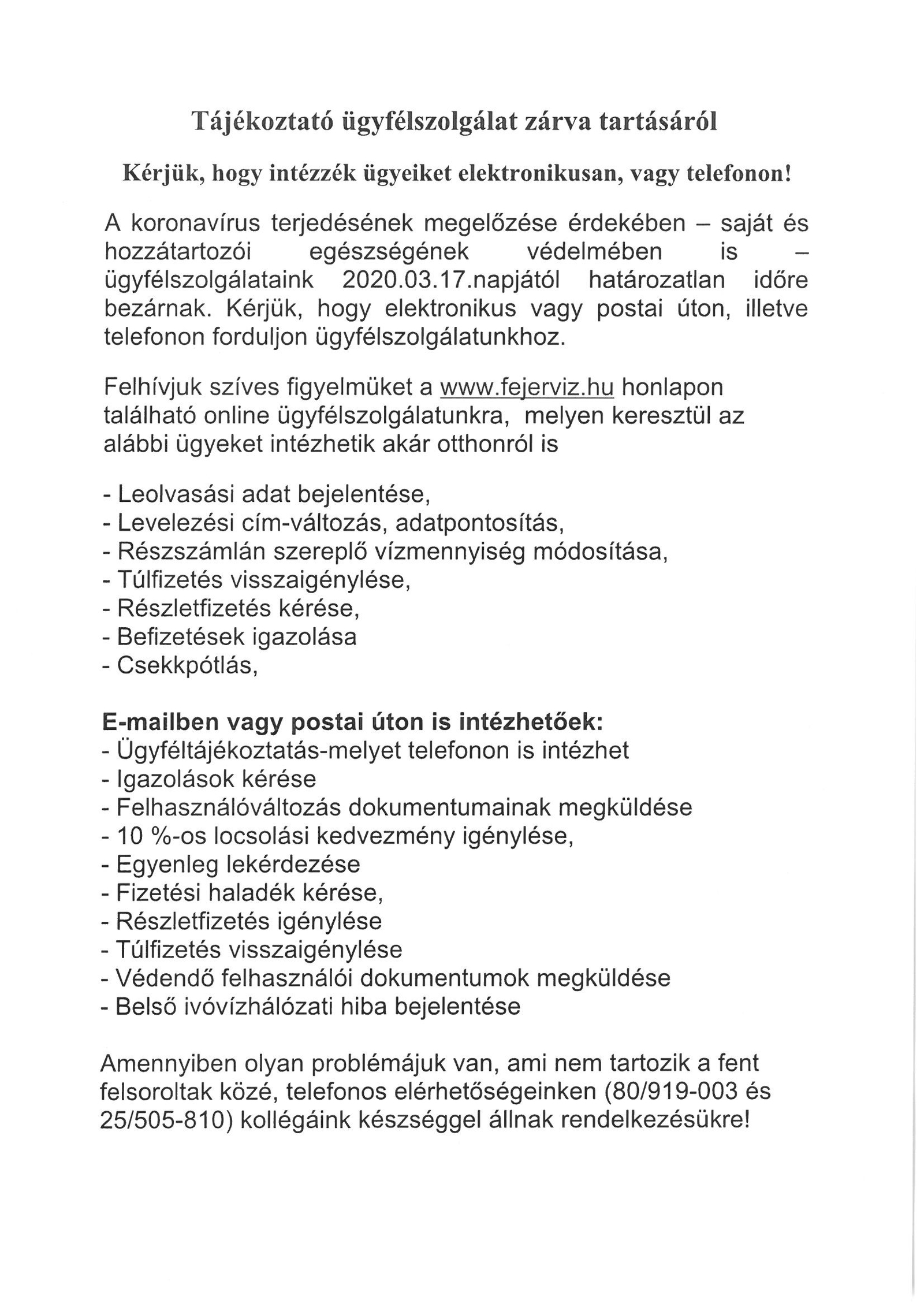 Határozatlan ideig bezárnak a Fejérvíz Zrt. ügyfélszolgálatai is